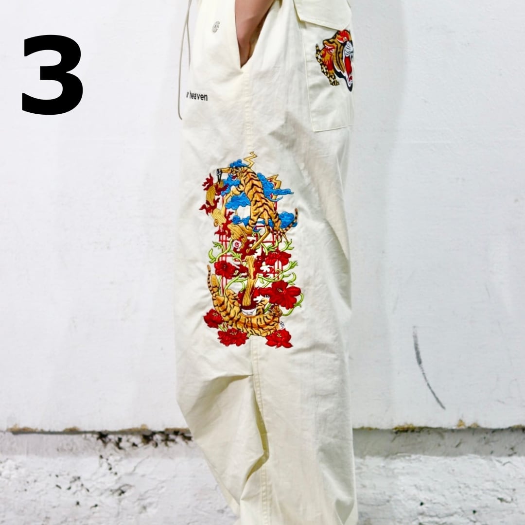 大人気商品トラックパンツが新作バルーンパンツで登場! 左太腿にインパクトある虎のイラスト全刺繍はそのままに、後ろポケットにワンポイント全刺繍を施したアイテム。 ウエスト調整可能な調整ゴム・裾を絞れる調整ゴム・メタリックなボタン着脱式のポケットを施した機能多様なバルーンパンツです。 スポーティな質感とトレンドを意識したシルエットが、ストリートな着こなしに最適な商品です。 SIZE : 【M】 ウエスト68cm 裾丈105cm 股下71cm 【L】 ウエスト70cm 裾丈107cm 股下73cm 【XL】ウエスト72cm 裾丈109cm 股下75cm ladies model (163cm):Lサイズ着用 LOGO:前・左太もも・後ろ 刺繍