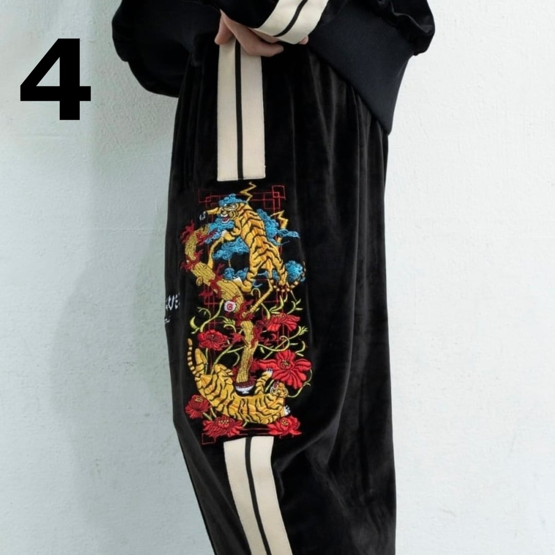 NEW COLOR! 今季大注目のトラックパンツに、新色のブラックが登場! 左太腿にインパクトある虎のイラストを全刺繍で施したアイテム。 程よくゆったりしたストレートシルエットで、サイドにラインを入れることでスタイルが綺麗に見えるように計算されたトラックパンツ。 サイドの全刺繍デザインが魅力的な目を引くライン加工や、 スポーティな質感とトレンドを意識した上品なシルエットが、絶妙に融合された今季の着こなしにぜひ取り入れたいオススメの商品です。 COLOR : black SIZE : 【M】ウエスト68cm 着丈95cm 股下58cm おすすめ身長~165cm 【L】ウエスト72cm 着丈97cm 股下60cm おすすめ身長165cm~175cm 【XL】ウエスト76cm 着丈99cm 股下62cm おすすめ身長175cm~185cm mens model 写真1~5枚目(170cm):Lサイズ着用 ladies model 写真6.7枚目(163cm):Mサイズ着用 mens model 写真8~12枚目(174cm):Lサイズ着用 LOGO:前、左サイド 刺繍