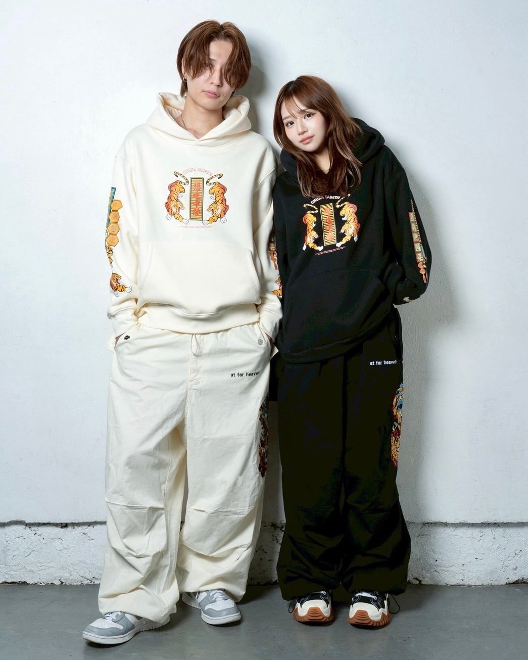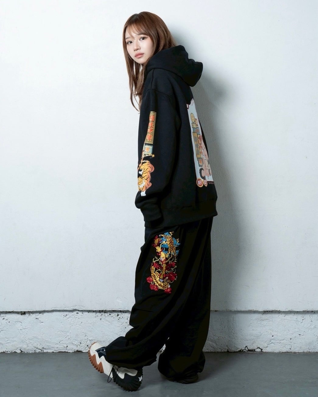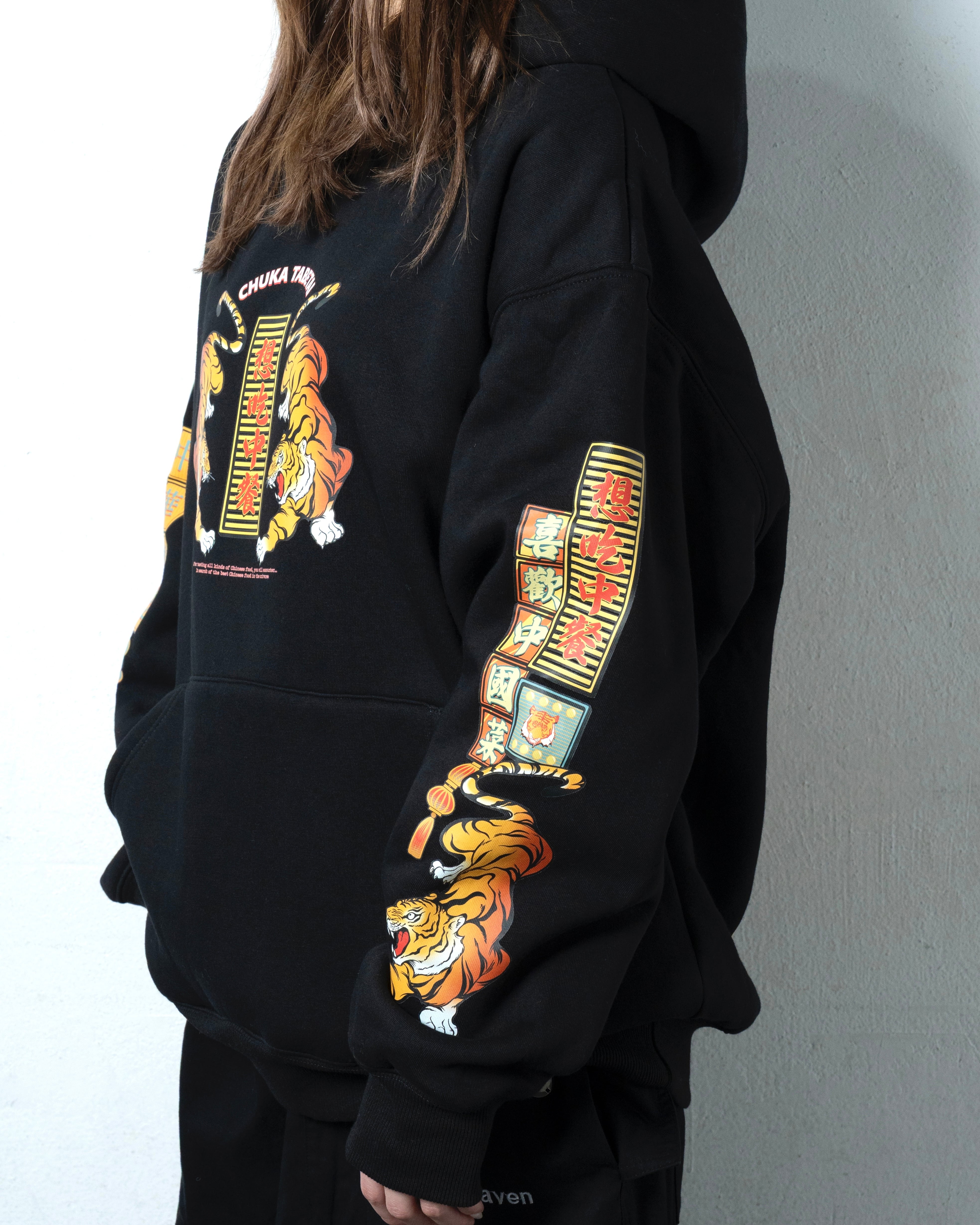 両袖にも虎や漢字モチーフを並べ、どの角度から見てもインパクト抜群の一着です。
