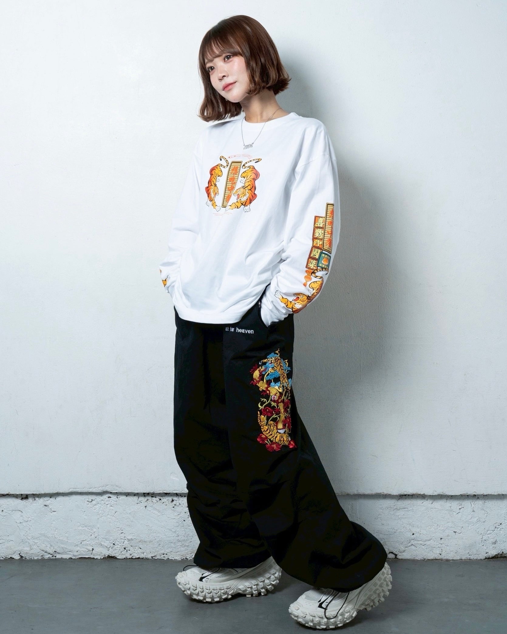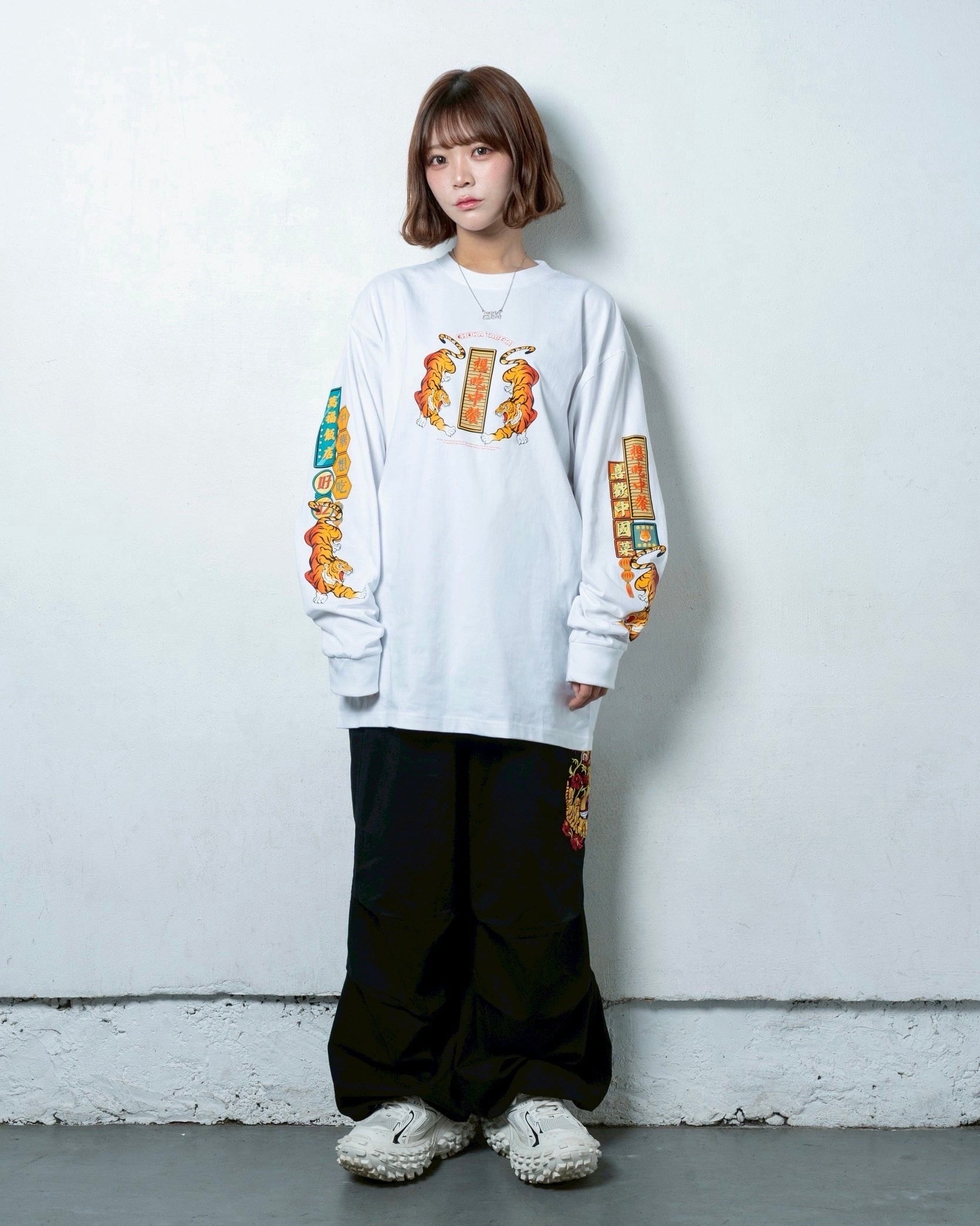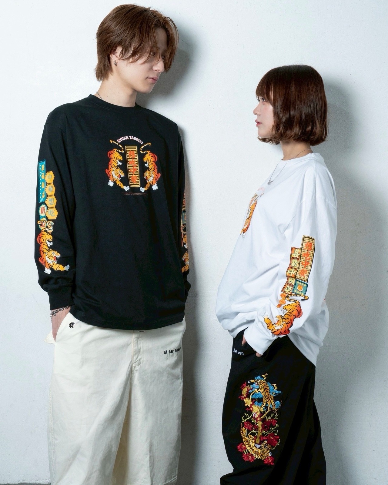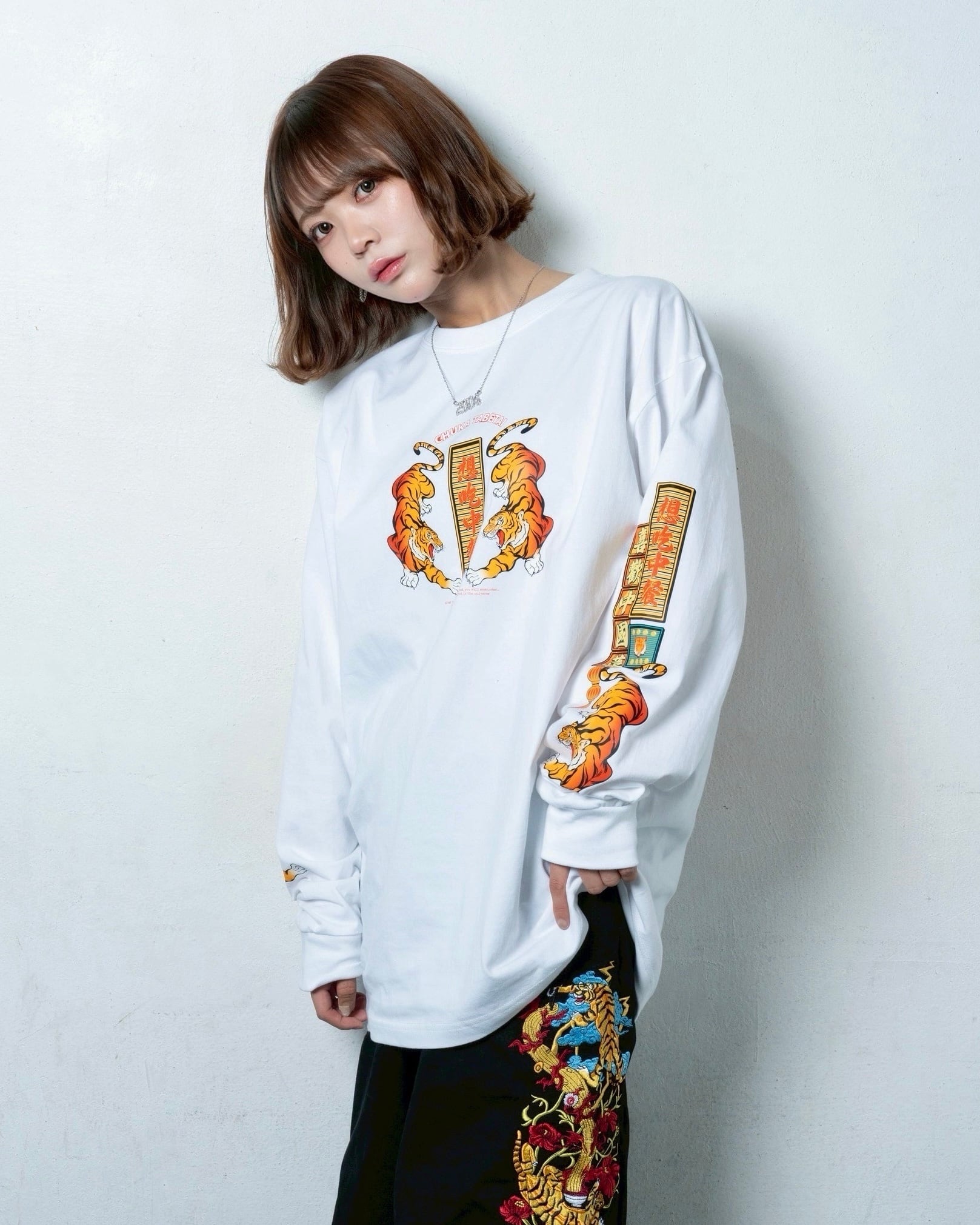 両袖にも虎や漢字モチーフを並べ、どの角度から見てもインパクト抜群の一着です。