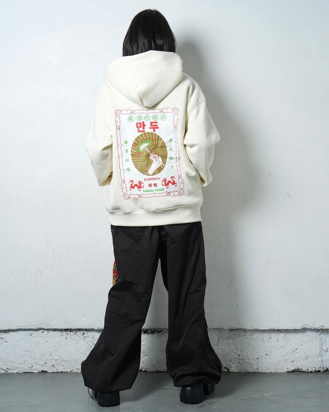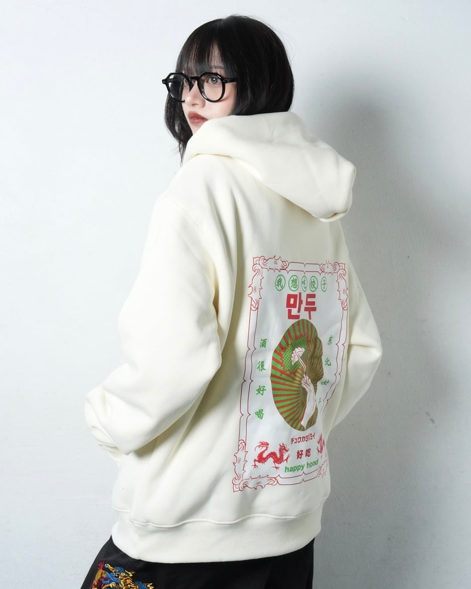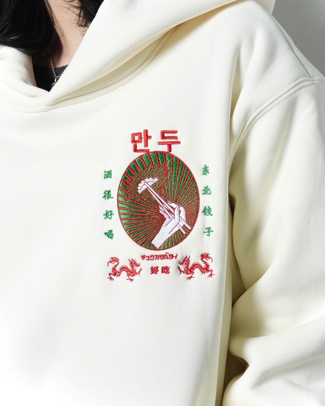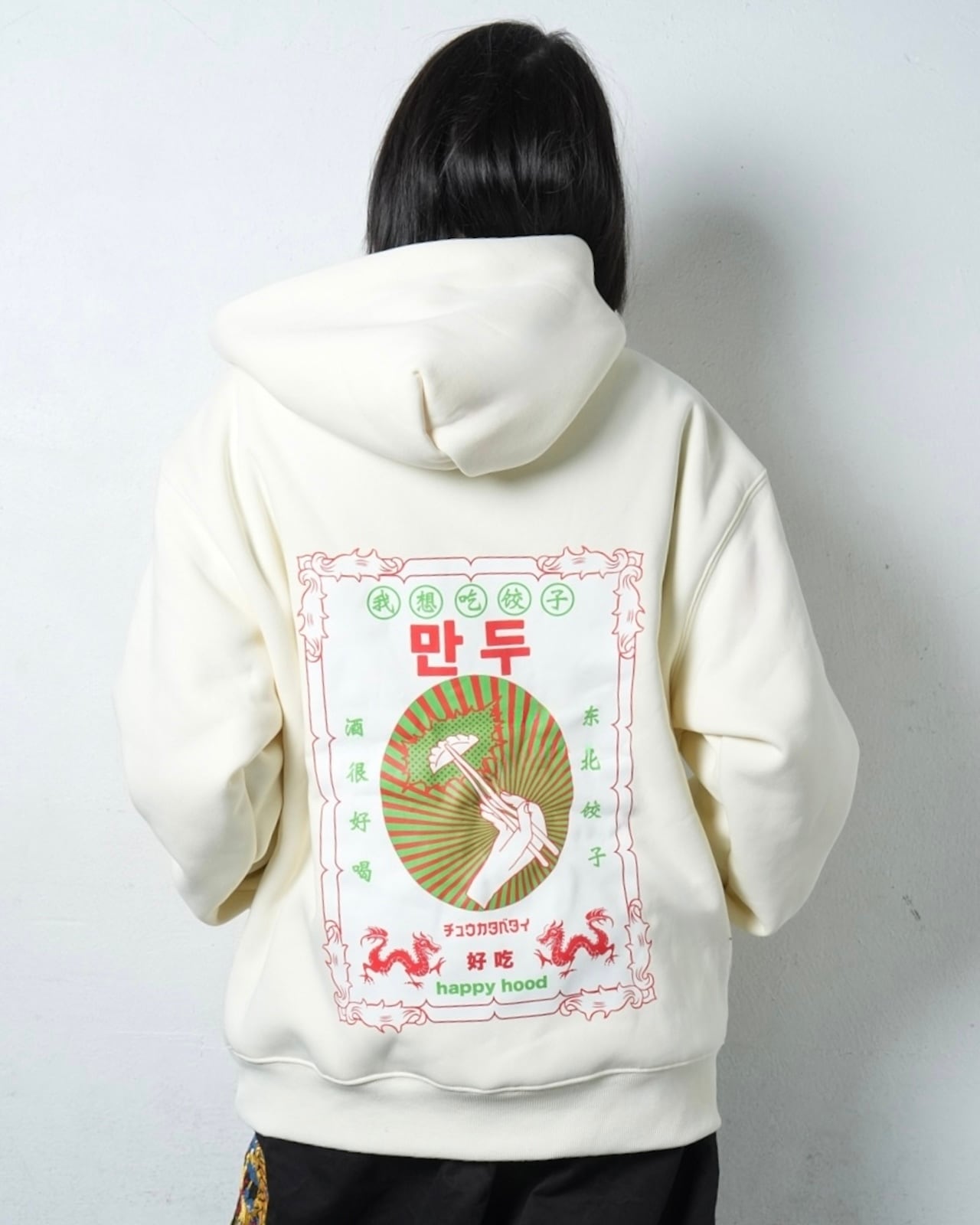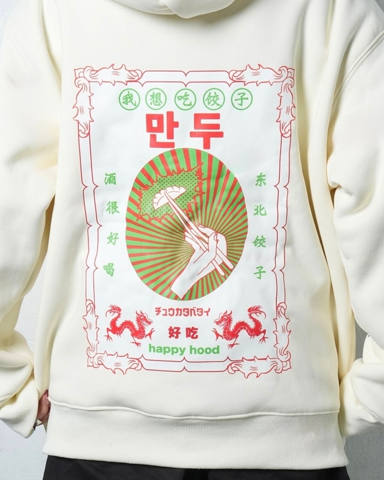 背面/前面どちらも中華全開の餃子中心に、龍やその他「만두」「我想吃饺子」などチュウカタベタイらしいロゴ文字がアクセントとして施されています。