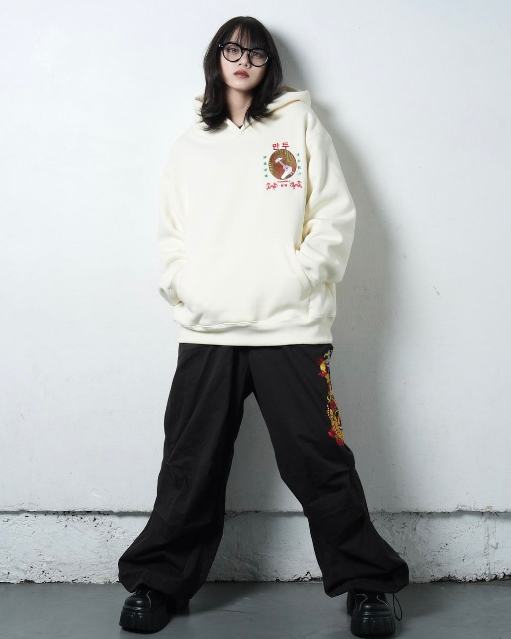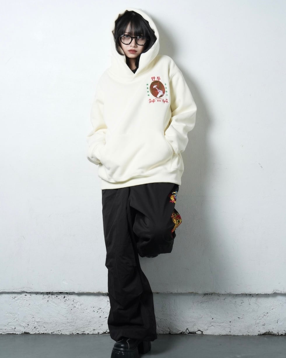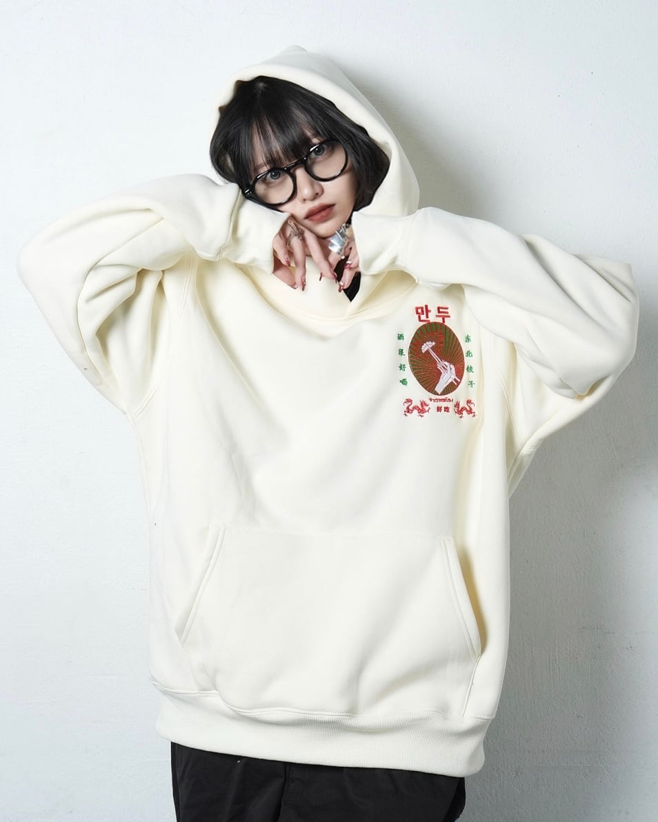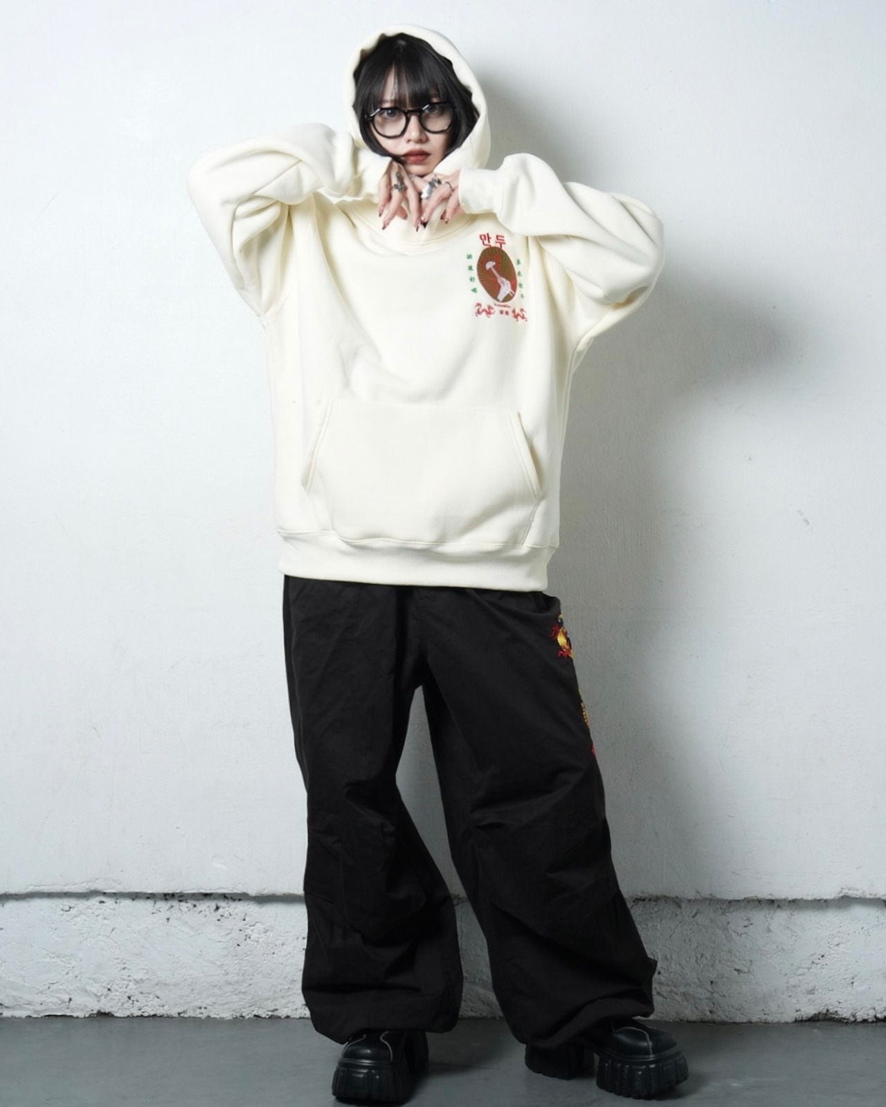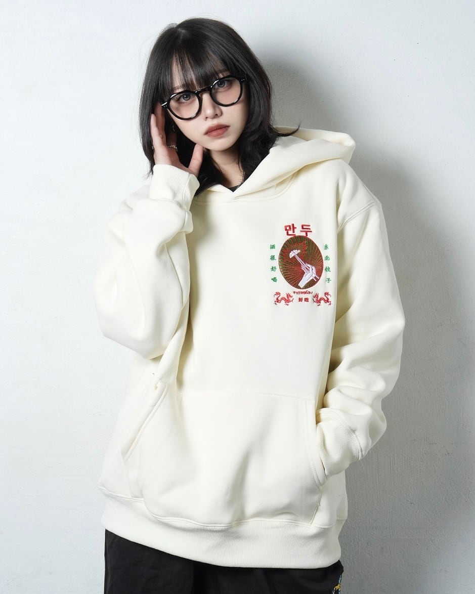 背面/前面どちらも中華全開の餃子中心に、龍やその他「만두」「我想吃饺子」などチュウカタベタイらしいロゴ文字がアクセントとして施されています。