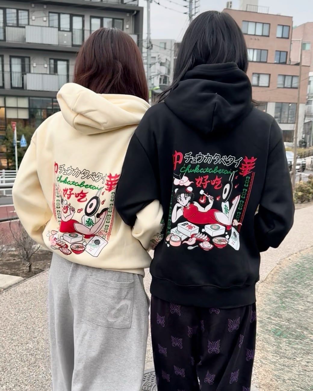 バックは、麻雀をイメージしたイラストに加えてポップで可愛い中華料理とチュウカタベタイ、好吃の文字を色鮮やかカラフルにビッグプリント!!