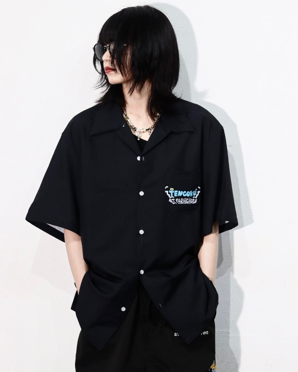 【天国】をイメージし、ブラックボディにアクセントとなるカラーリングでフルカラープリント。天国と地獄の境を彷彿させ、独特なグロテスクな表現が特徴的なイラストです。